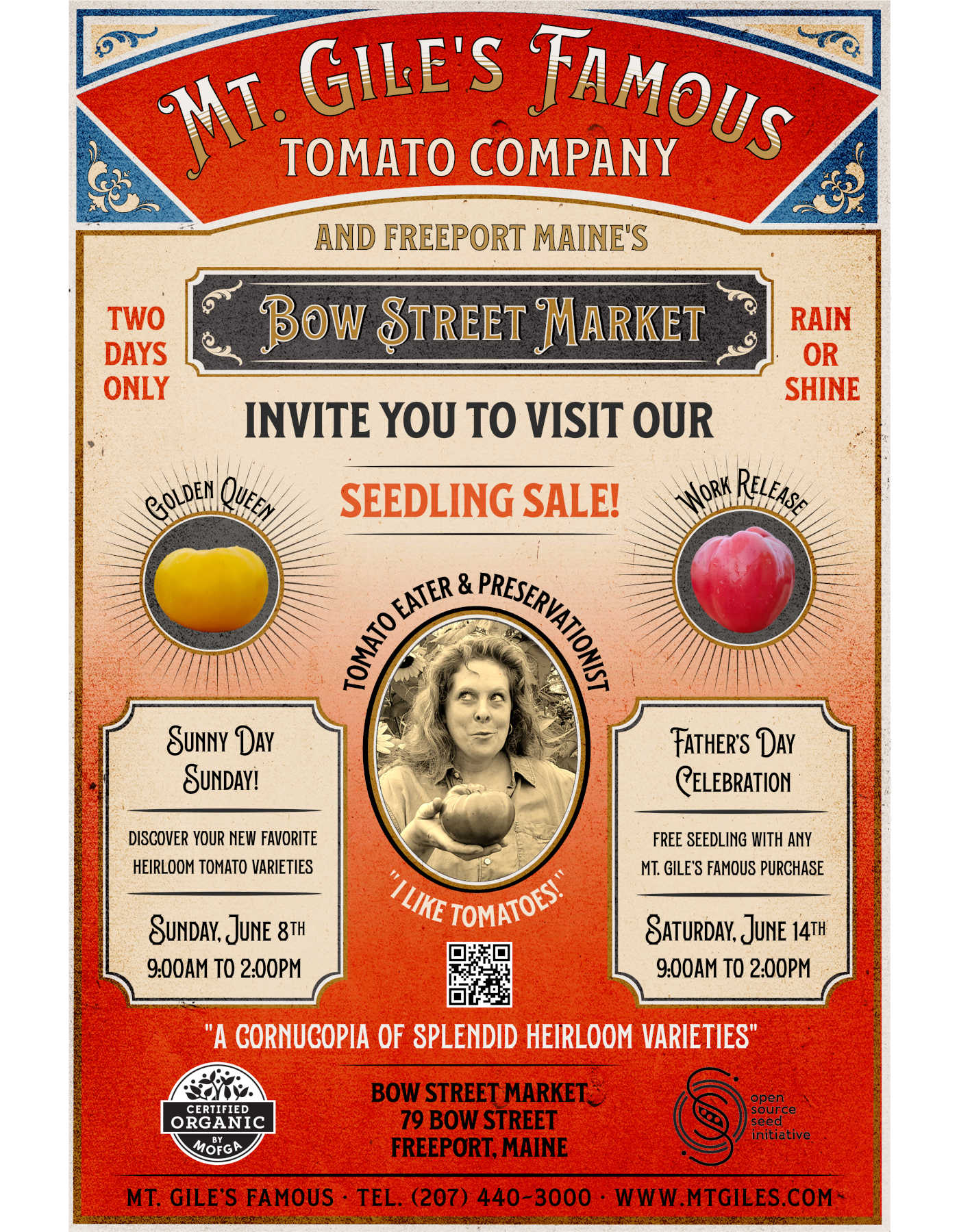 Mt. Gile's Famous certified organic tomato seedlings will be available on Sunday, June 8th, and Saturday June 14th at Bow Street Market in Freeport. Christy will be there to chat about tomatoes and help you find some new favorite varieties. We hope to see you there!