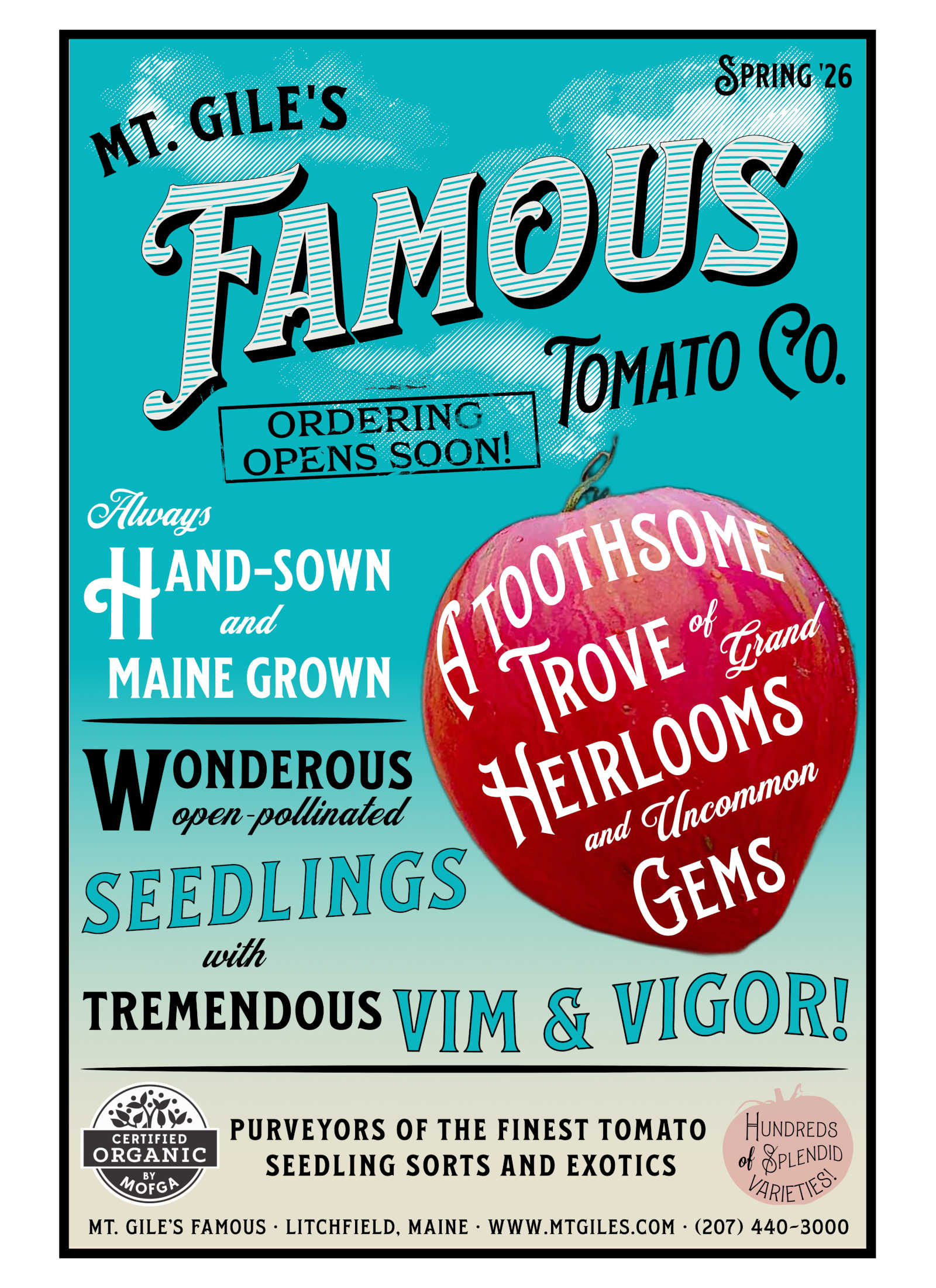Mt. Gile's Famous certified organic tomato seedlings will be available on Sunday, June 8th, and Saturday June 14th at Bow Street Market in Freeport. Christy will be there to chat about tomatoes and help you find some new favorite varieties. We hope to see you there!